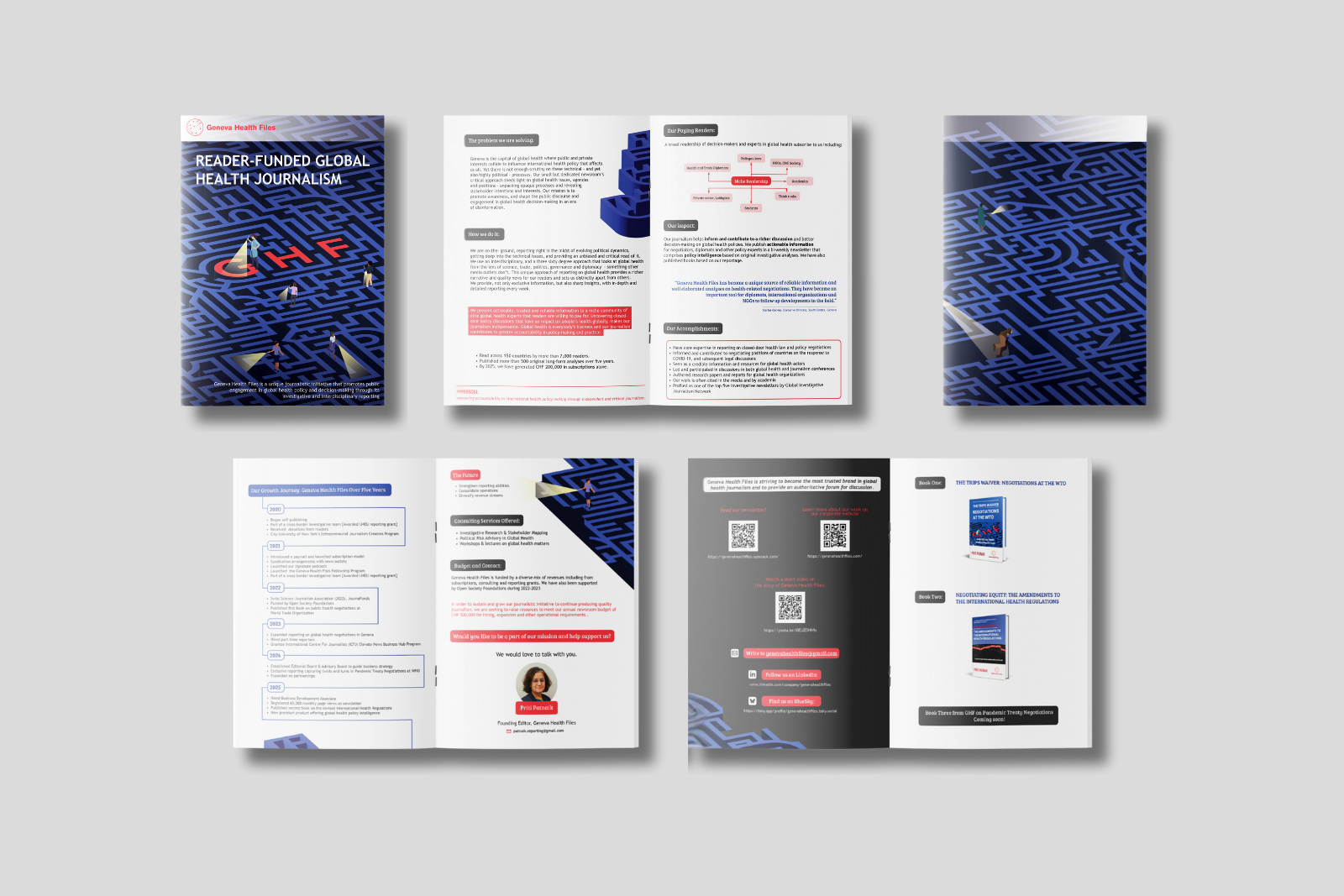 To strengthen Geneva Health File’s visual expression, Chembe Collaborative created bespoke illustrations that translate complex ideas into accessible, memorable imagery. The work extended across website visuals, multiple book covers, and event materials, demonstrating the value of visual communication across mediums.
