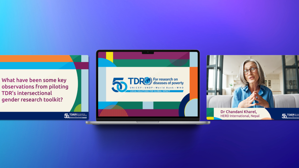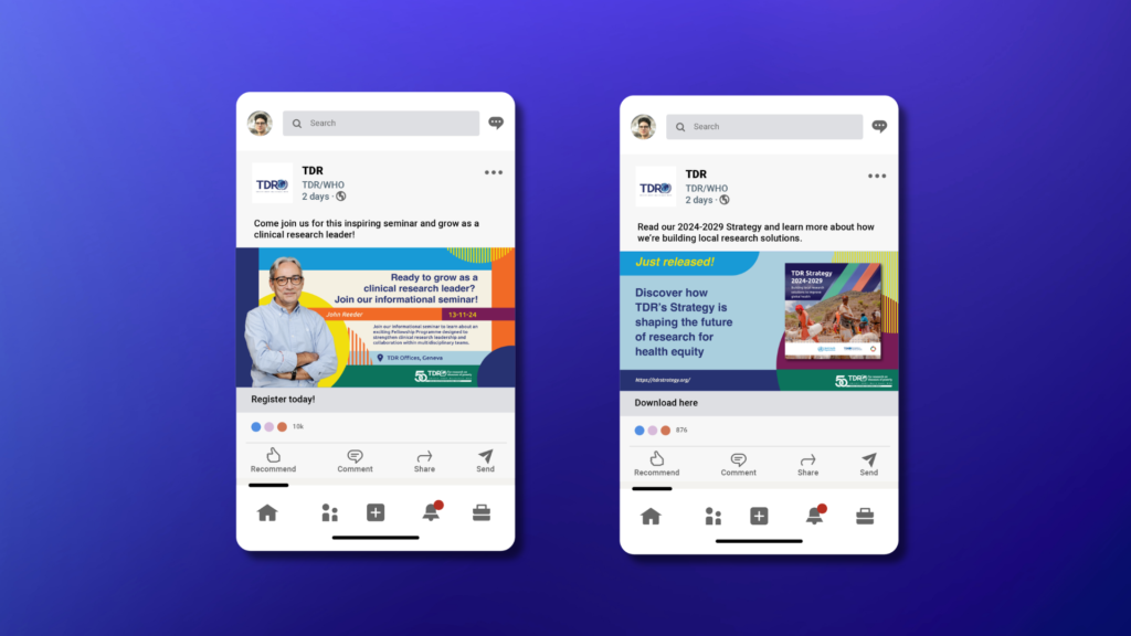 Inspired by the Global Health Matters branding, the refresh retained key elements of the existing identity, including the established typefaces, tones from the previous colour palette, and TDR’s striped pattern. Building on this foundation, we introduced a brighter, more flexible visual system through geometric forms such as circles and rectangles, alongside a distinctive custom “50” mark used across anniversary materials.